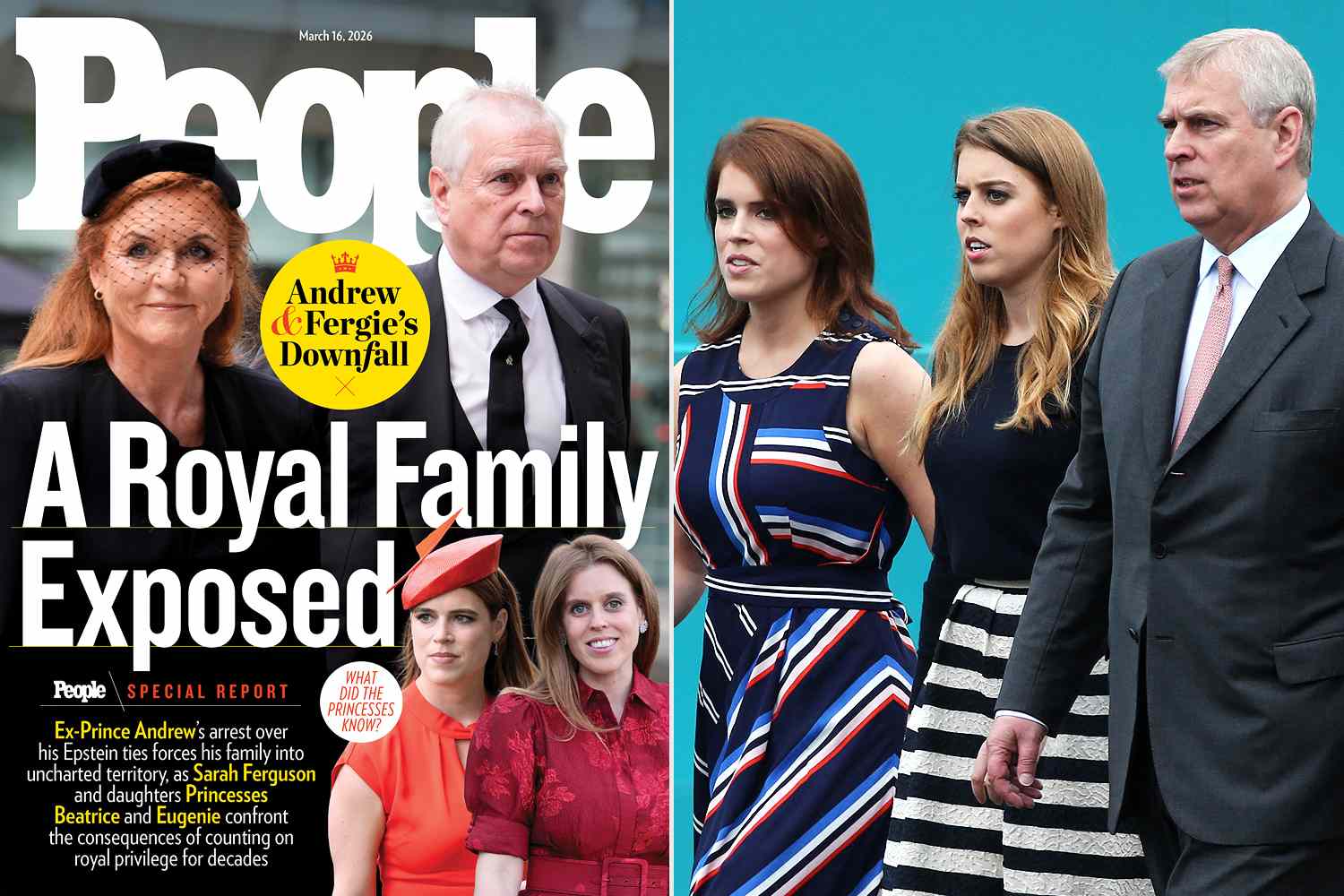 Left: Sarah Ferguson and ex-Prince Andrew; Right: Princess Eugenie, Princess Beatrice and Andrew in 2016