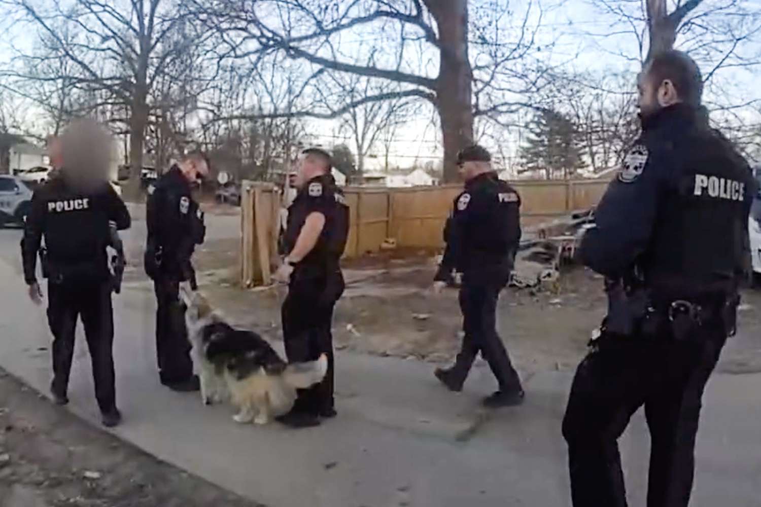 "I'm kind of being a little leery of the dog. He's barking, chirping at me a little bit, and then continues to follow me back to the front porch again to knock on the house again," Thompson said in LMPD's video.