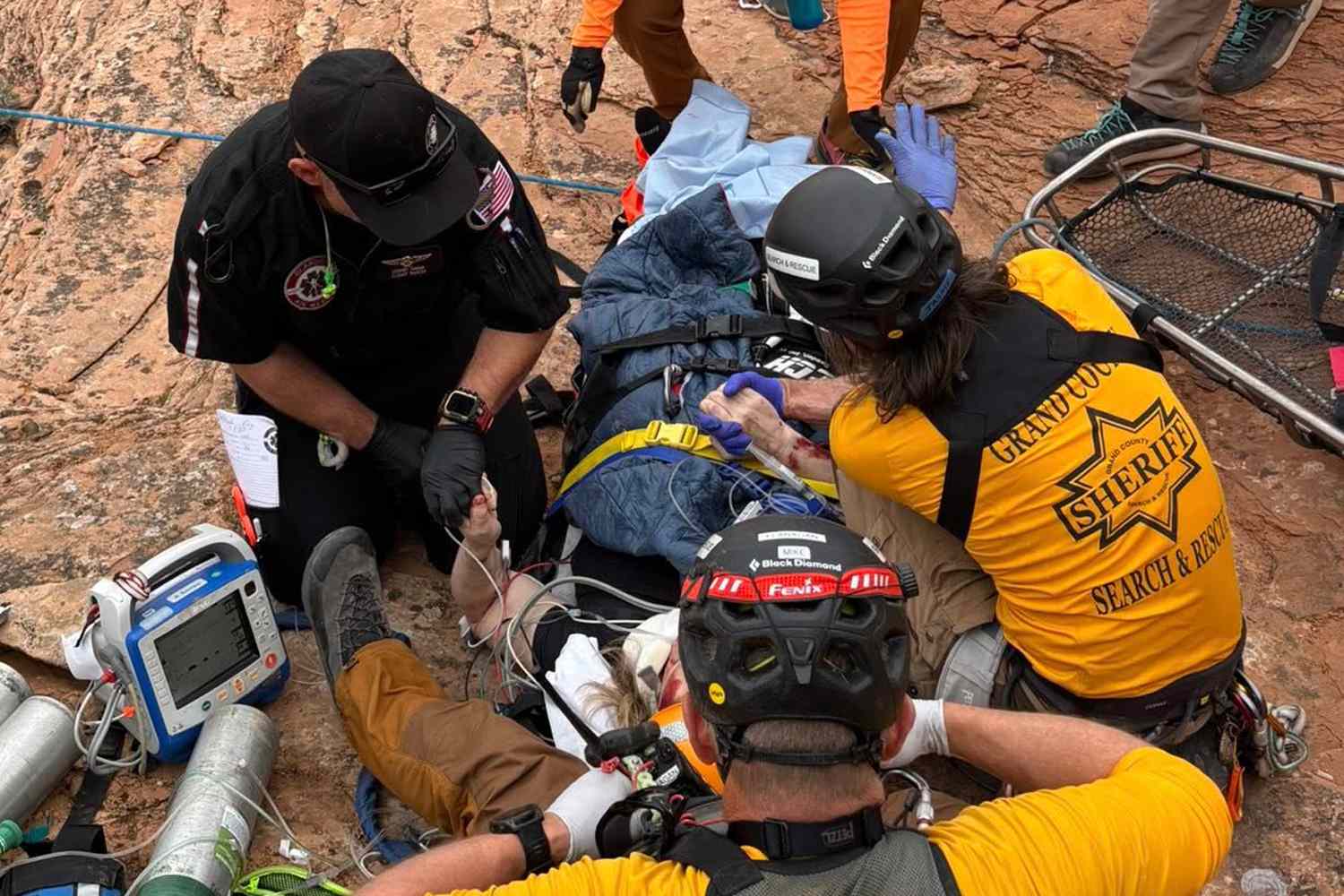 From the air, search and rescue team members determined they’d have to climb up a slanted rocky channel to reach the parent, who had fallen an estimated 70 to 80 feet before tumbling farther down the sandstone.