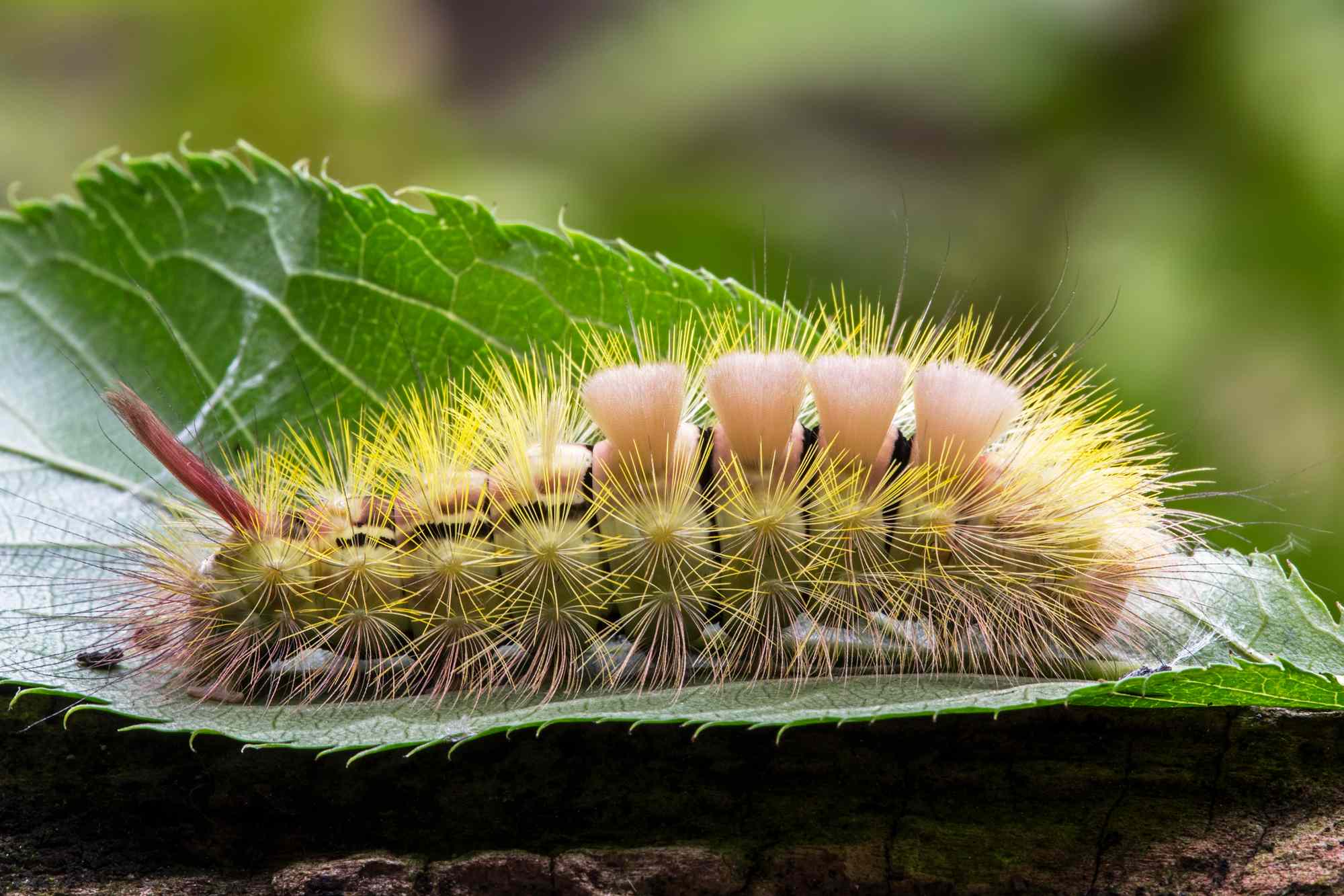 A tussock moth caterpillar on a leaf