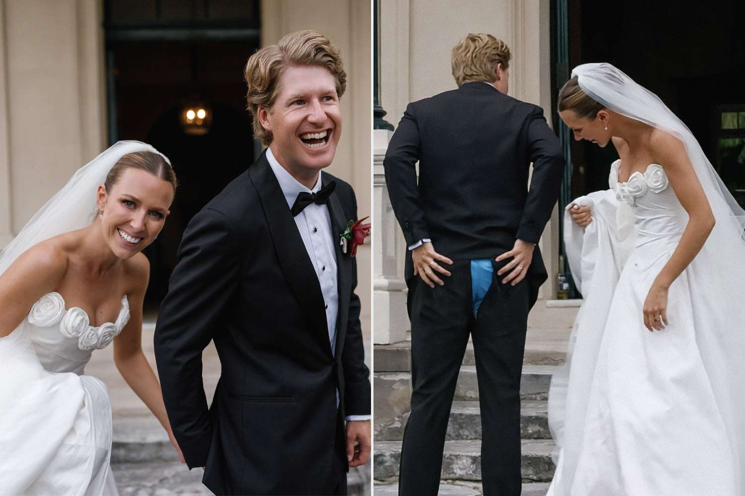 "George knew immediately, the sound was genuinely loud," the bride recalls of the tear. "It took me a few seconds longer to piece together what had happened, but the moment he whispered 'my pants,' I knew he must have torn them when he squatted down to pick me up."