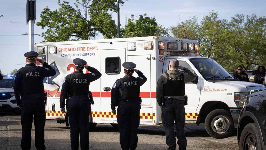 Officer John Bartholomew, 38, was fatally shot, while an unidentified officer, 57, was critically injured in the incident Chicago Police Department officers salute as...