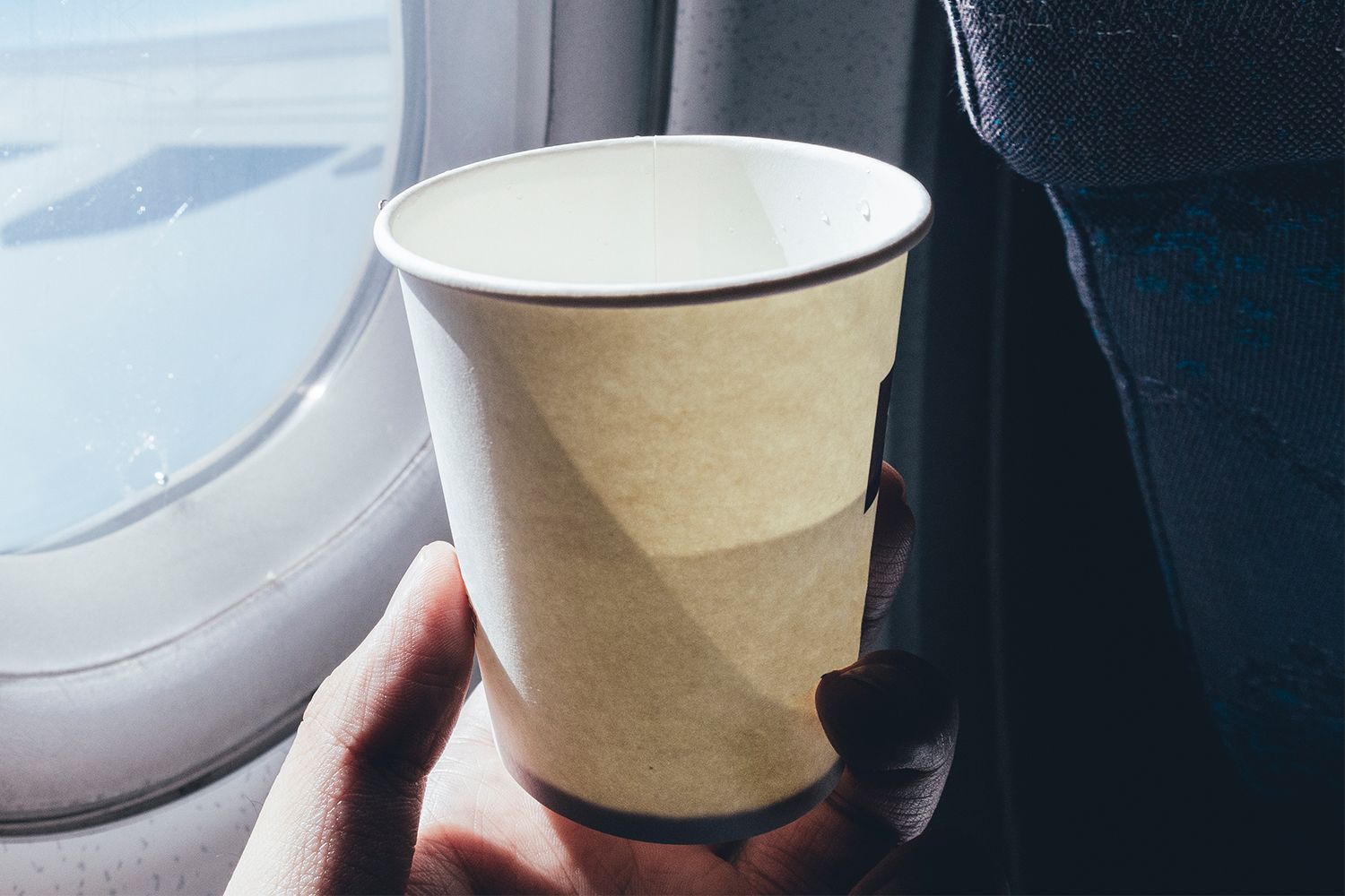 Stock image of an un-lidded drink on an airplane