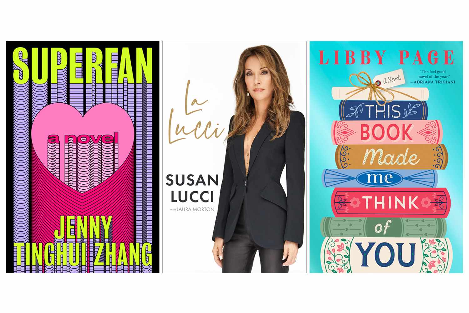 The covers of 'Superfan' by Jenny Tinghui Zhang, 'La Lucci' by Susan Lucci and 'This Book Made Me Think of You' by Libby Page