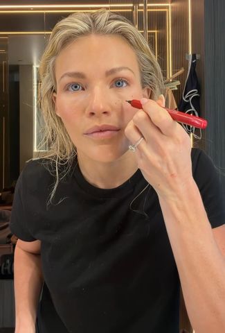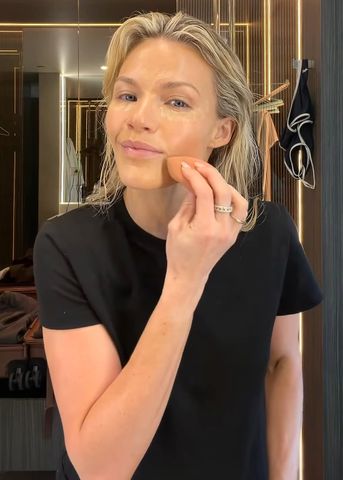 The Dancing with the Stars pro begins by putting a few pumps of foundation on her face before taking a makeup brush to blend it together. She's thorough with it, softening the various shades around her cheeks and forehead.