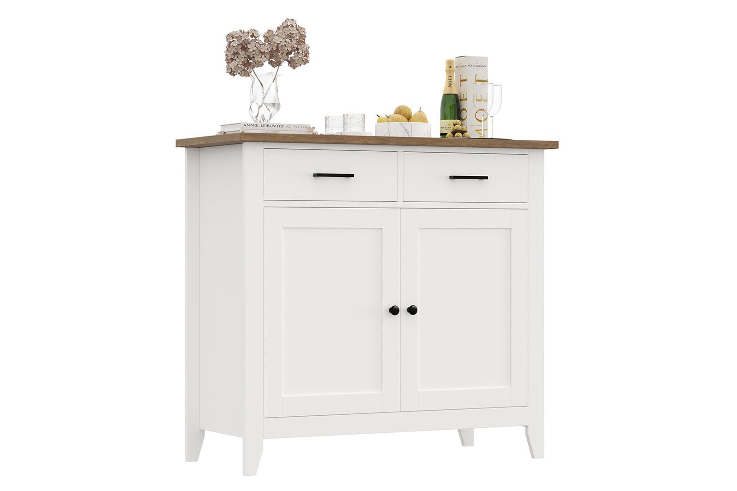 The versatile cabinet features spacious double drawers and hinged doors that reveal two interior shelves — ideal for storing board games, table linens, serveware, and towels. Its engineered wood countertop showcases natural wood grain color variation for a warm, earthy accent. At the same time, matte black knobs and handles provide a pop of contrast to its crisp white exterior. The cabinet is also available in all black for a monochromatic look.