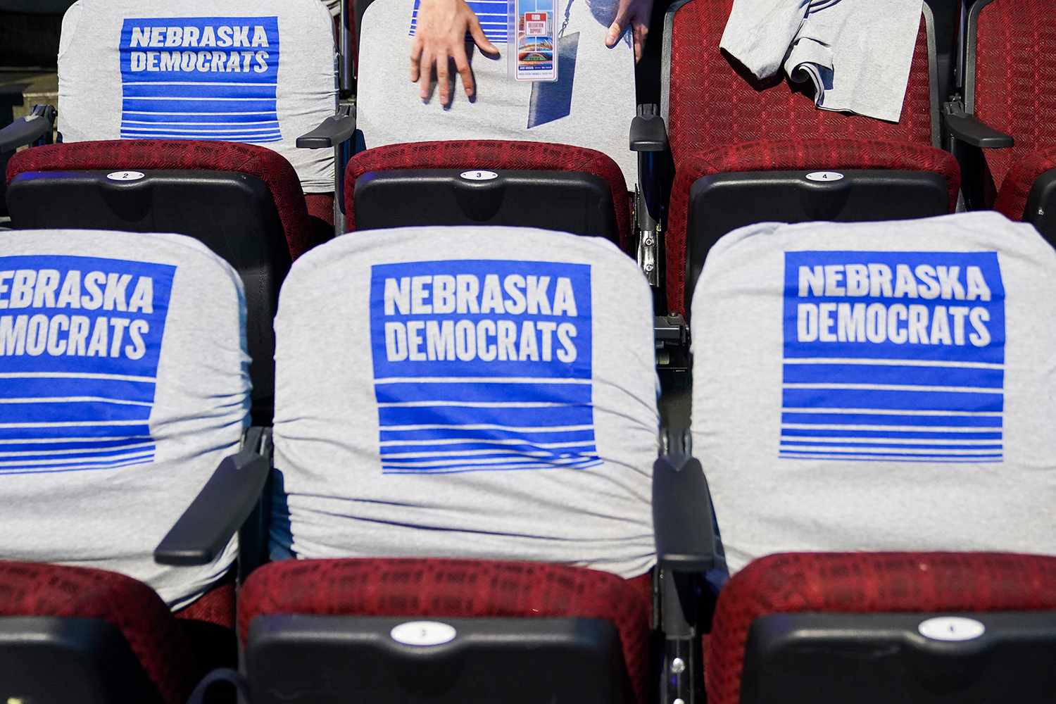 Chairs with signs reading "Nebraska Democrats" at the 2024 Democratic National Convention in Chicago
