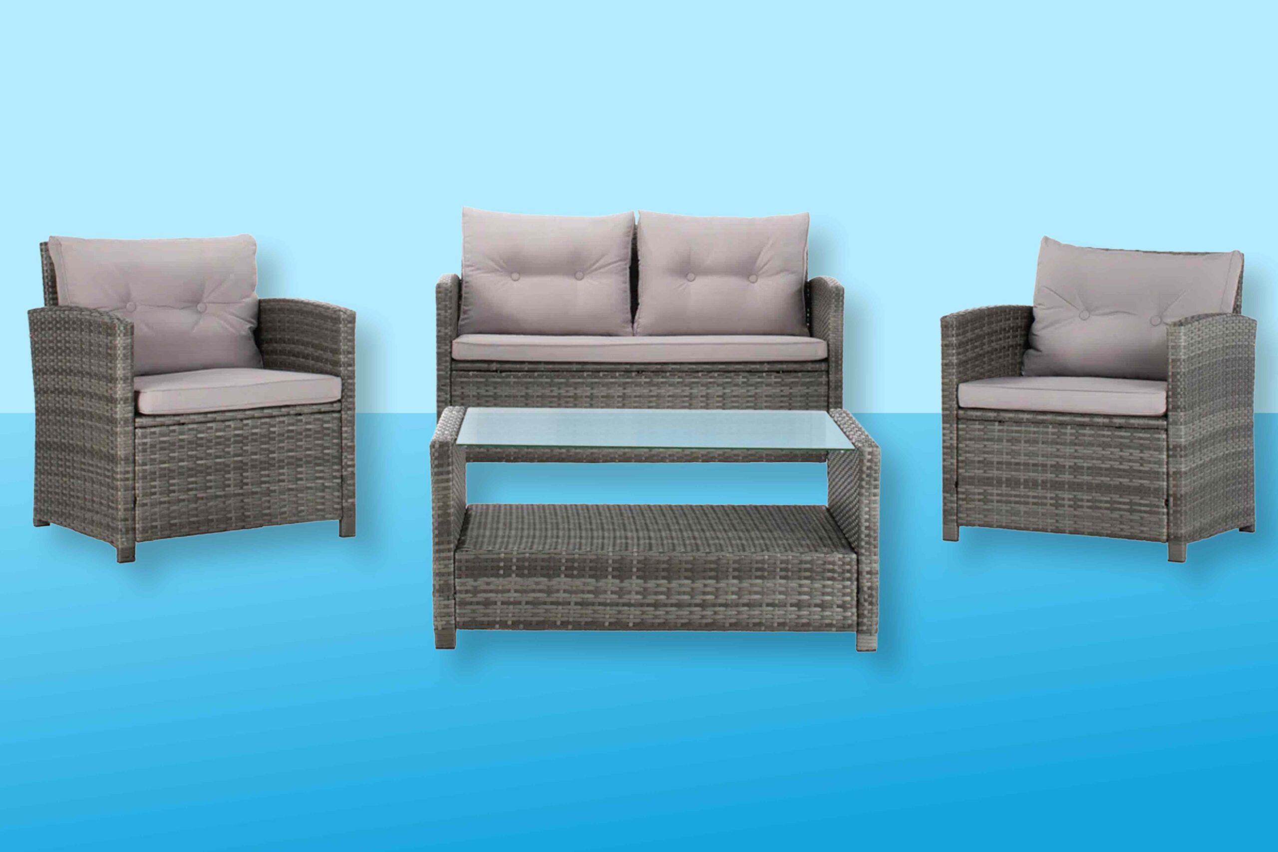 This sturdy four-piece set makes it easy to create an inviting outdoor living space on your deck or patio for guests. Built with a durable steel frame and resin wicker, it’s designed to last for years to come, while the cushions feature zip-off, machine-washable covers for easy care. The generously sized coffee table is topped with glass that’s suitable for serving food and drinks.