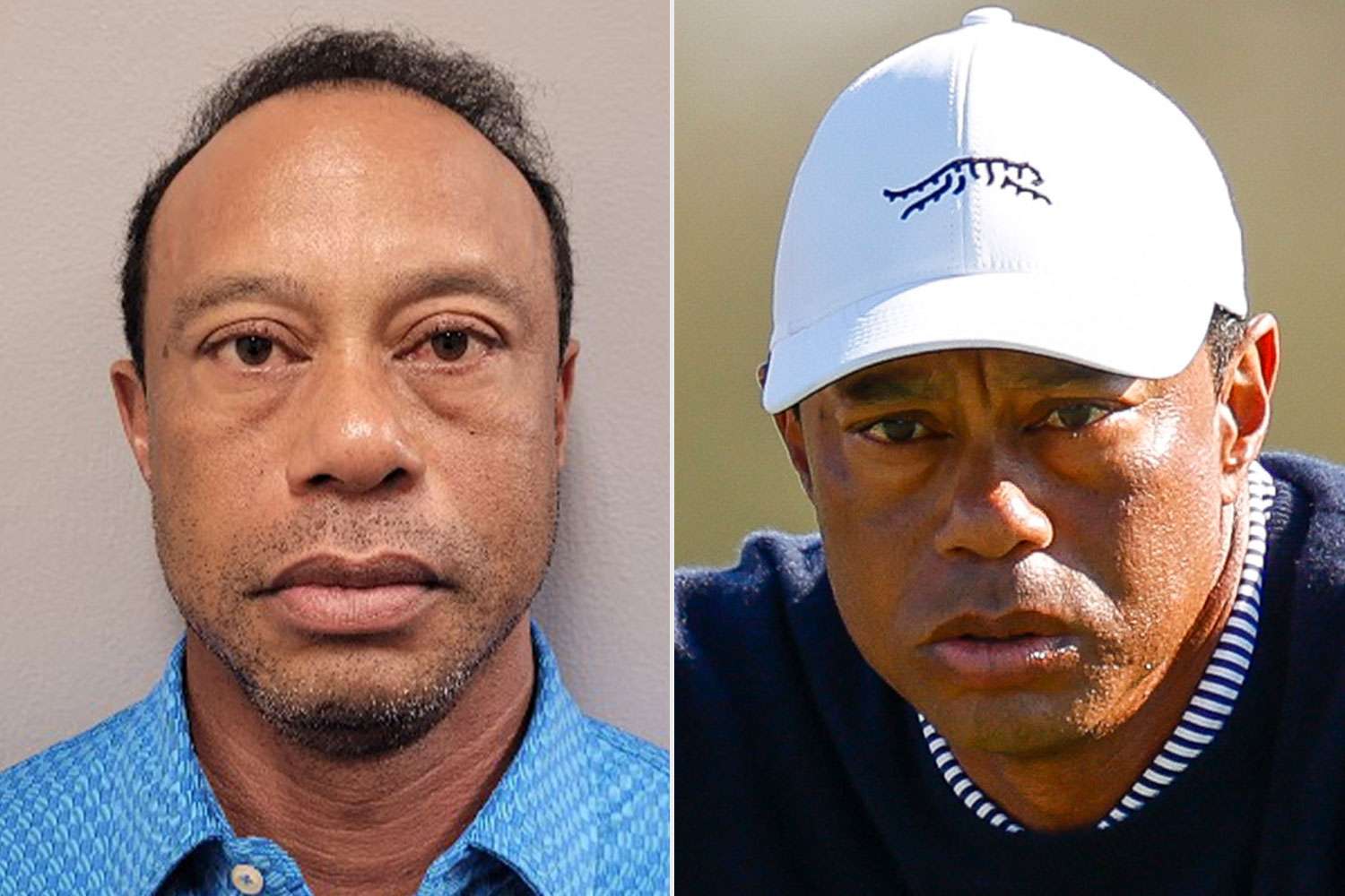 Tiger Woods' March 27 mugshot; Tiger Woods in December 2024